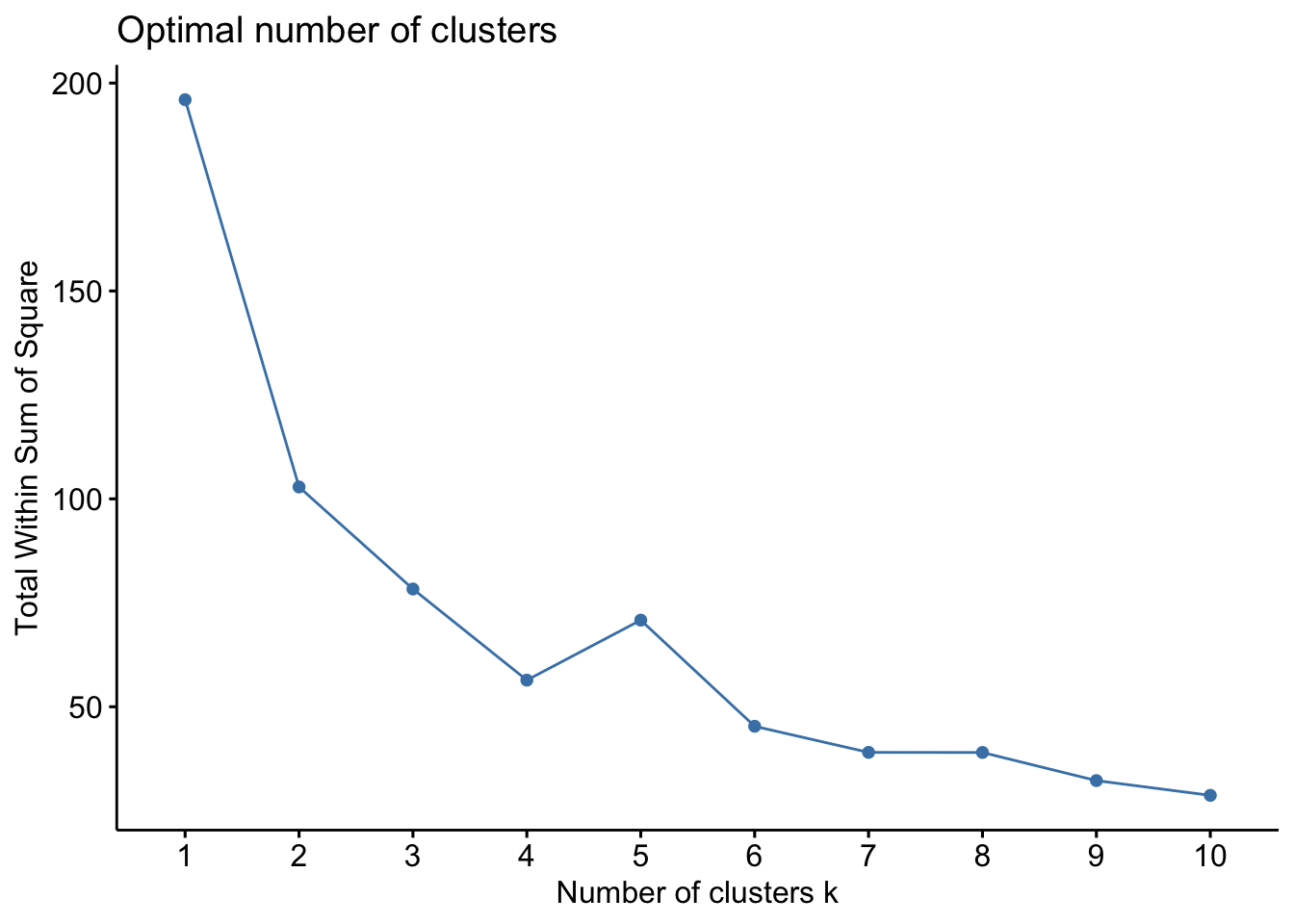 minimize(_{k = 1}^{k}W(C_k)) $$ where is the cluster and is the within-cluster variation. The total within-cluster sum of square (wss) measures the compactness of the clustering and we want it to be as small as possible. Thus, we can use the following algorithm to define the optimal clusters: